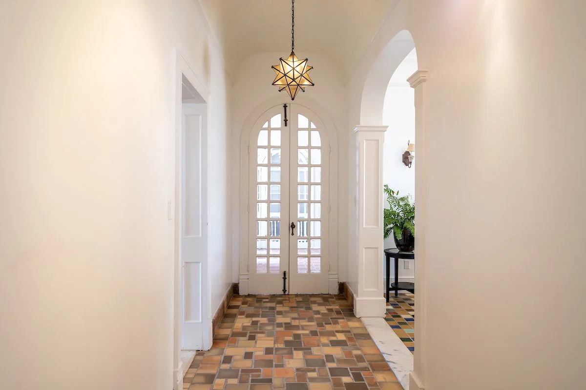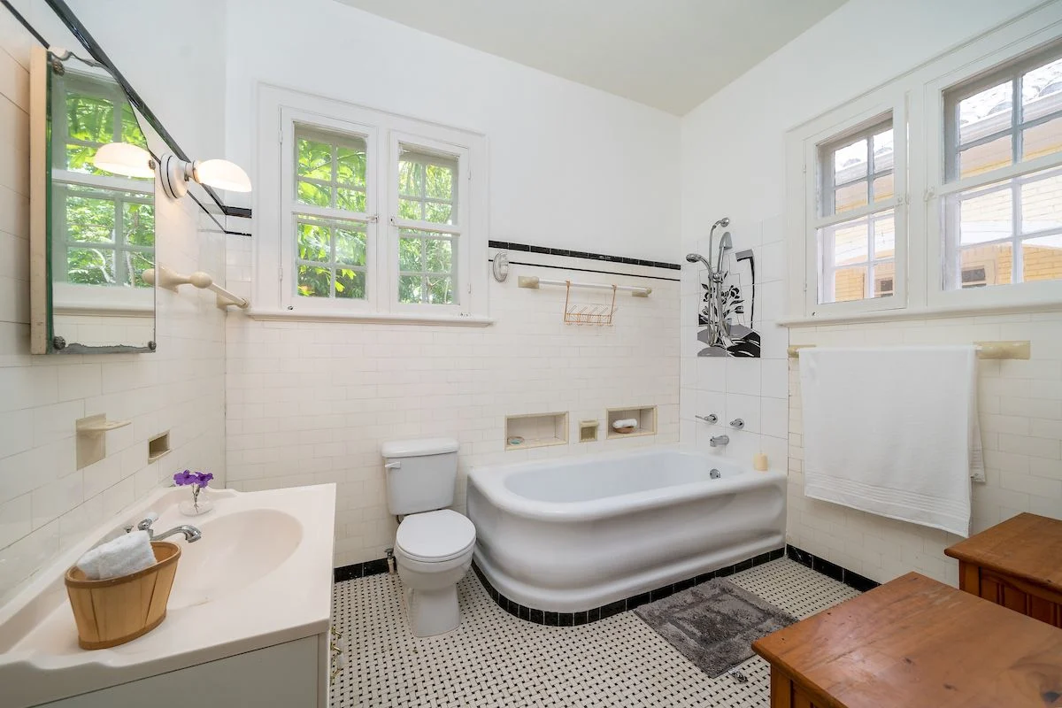 As time passed, modern comforts have been added to the home including air conditioning. In the 2000s, the small galley kitchen, original to the home, was converted into a powder room plus laundry room, and a large kitchen was added. Even with the new additions, however, much of the original flooring remains intact.